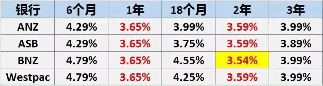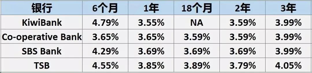 以下是新西兰四大银行的房贷固定利率(2019年9月18日):