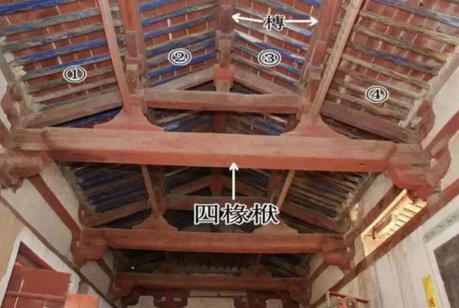 四椽栿,栿(fú)就是梁,建筑的纵向主要承重构件,栿上面横向的构件是槫(tuán),现在称为檩条,槫上面纵向搭的小木棍是椽(chuán),两条槫之间的椽子称为一架椽,照片中这条栿托了四架椽子,称为四椽栿。同理托六架椽子的就是六椽栿。