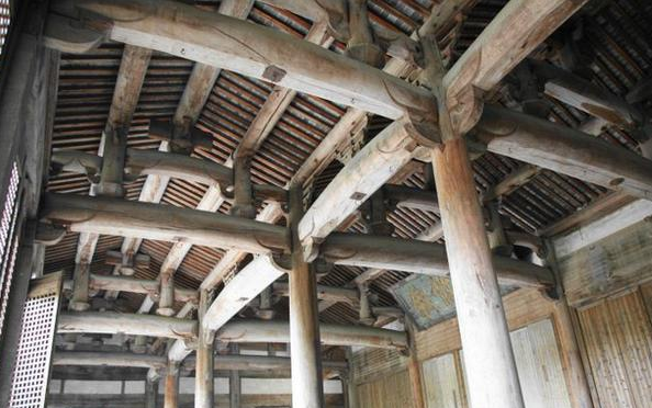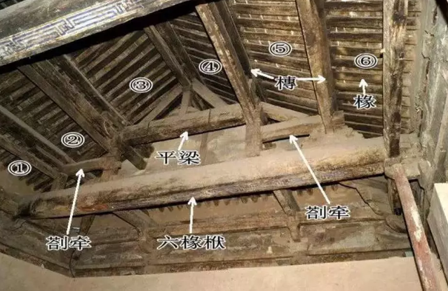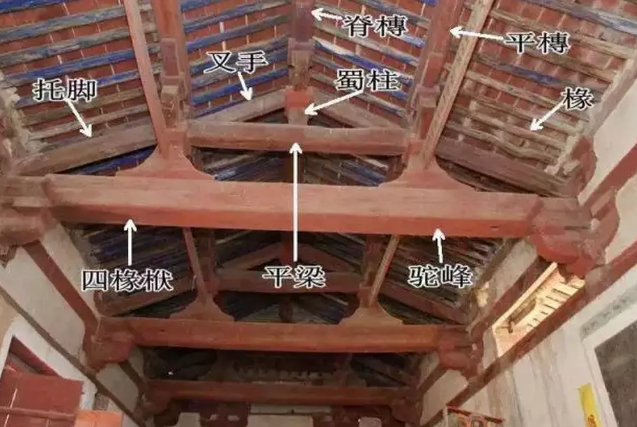 古建筑的梁架结构有多种组合,这也是一座六椽檐栿通搭的建筑,结构与上图有很大不同,六椽栿上用四椽栿,四椽栿上用平梁(两椽),逐层递减,形成中国式房屋的山尖。