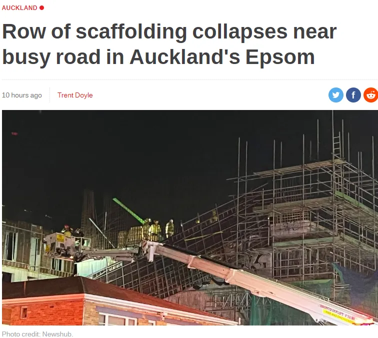 昨天下午,奥克兰Epsom住区的Manukau Rd上,发生一起脚手架坍塌事件,紧急清理和加固工作一直持续到晚间,而互联网上也有大量照片流传。