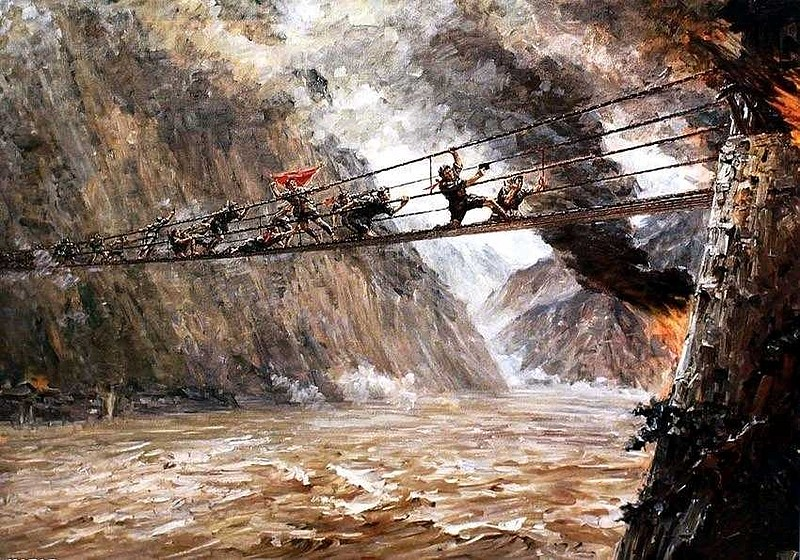 金沙水拍云崖暖,大渡桥横铁索寒。